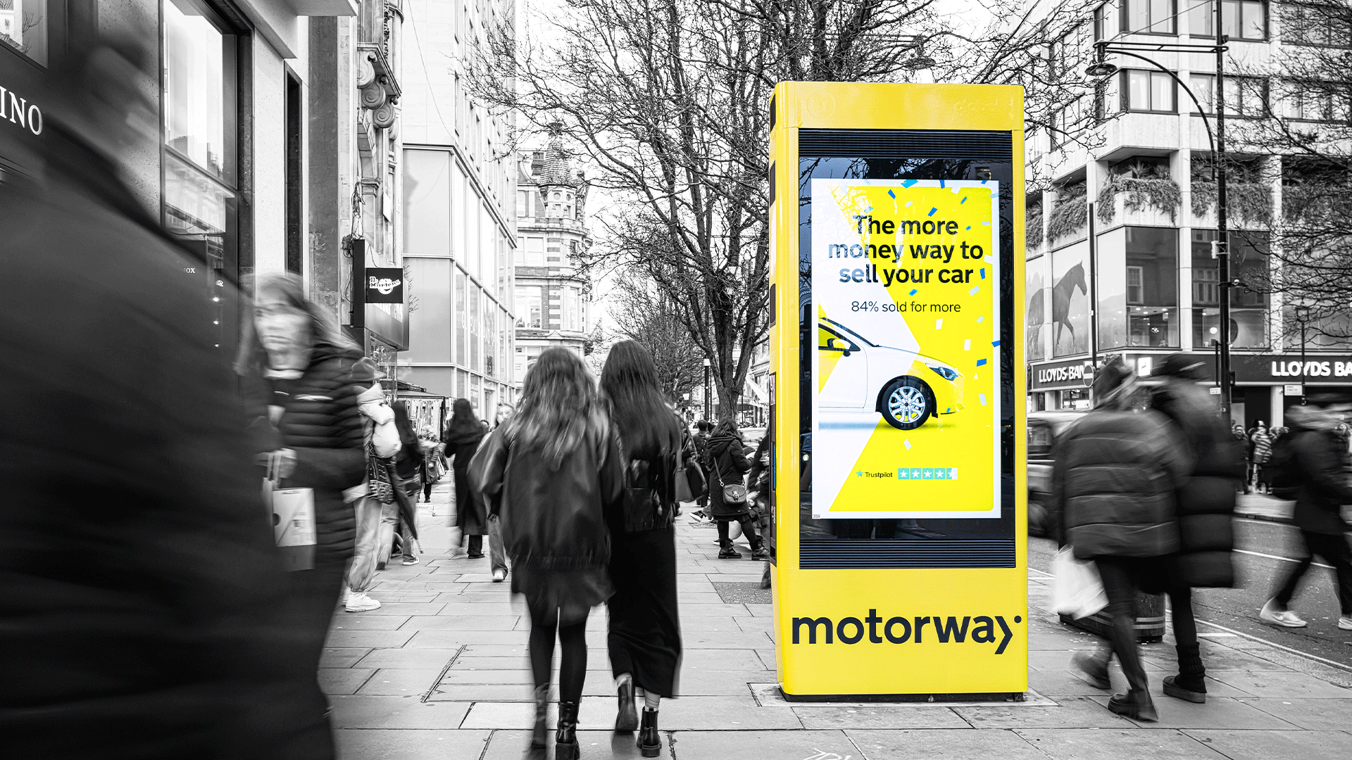 I took Motorway’s bold yellow brand onto the streets and the London Underground. The activation combined distinctive wrapped street hubs, bright digital screens, and an animated digiwall bursting with celebratory confetti — bringing energy, movement, and recognition to the brand’s message of simple car selling.
