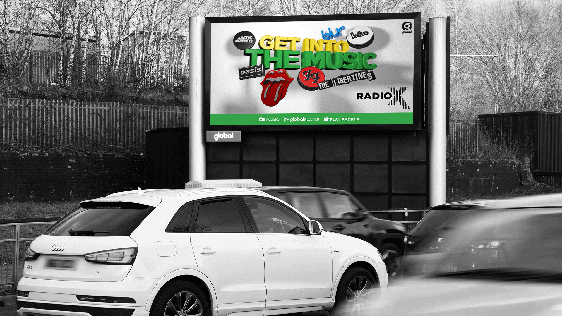 I designed a series of digital billboards for Radio X, featuring iconic song lyrics brought to life with 3D text and band logos created in Cinema 4D. Each design paired a famous line with the artist’s emblem in a bold, textured style that captured the attitude and edge of rock and indie culture. The result was a striking static campaign that gave legendary lyrics real depth and presence on screen.